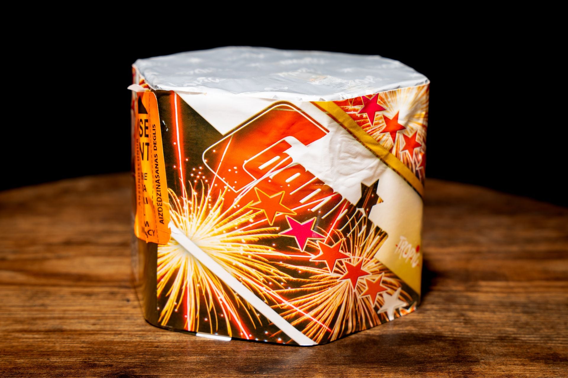 8 shots: red tail to blue stars; white glittering; 8 shots: green tail to red stars; last 3 shots: green tail to red coconuts.