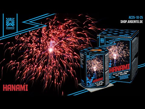 10 Schuss Batterie im Kaliber 25mm. Blauer Leuchtspur-Aufstieg zu blauer Päonie mit roten Blütensternen.