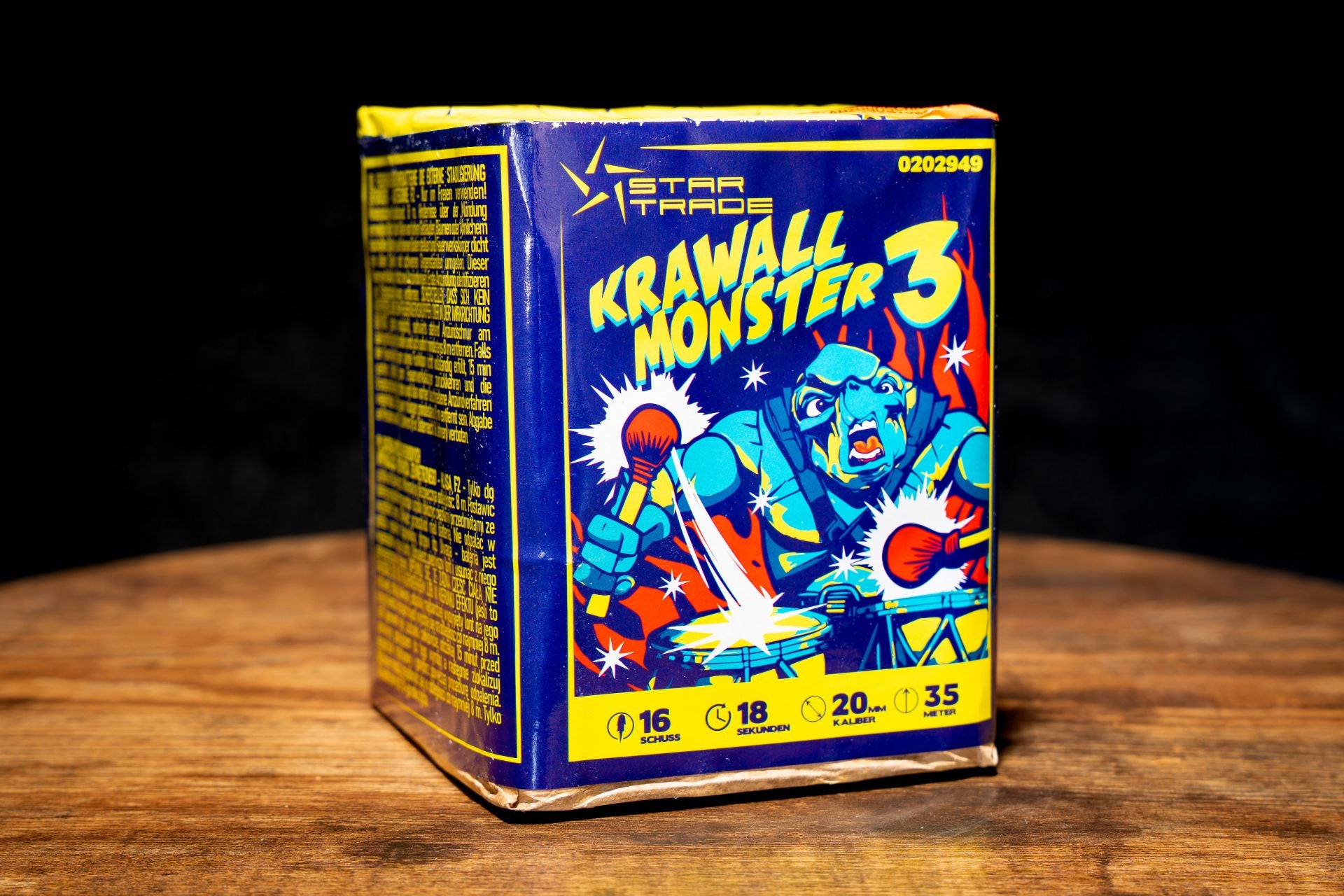Für das kleine Kaliber macht das Krawallmonster nun auch richtigen Krawall. Das sehr dunkele Corolla Gold kommt im Video leider nicht so gut zur Geltung wie live. Effektbeschreibung: Abwechselnd geschossene Corollaschweife zu Corollaweiden mit blauen Sternen & Titansalut sowie Finalsalve mit Corollaschweifaufstieg zu Titansalut