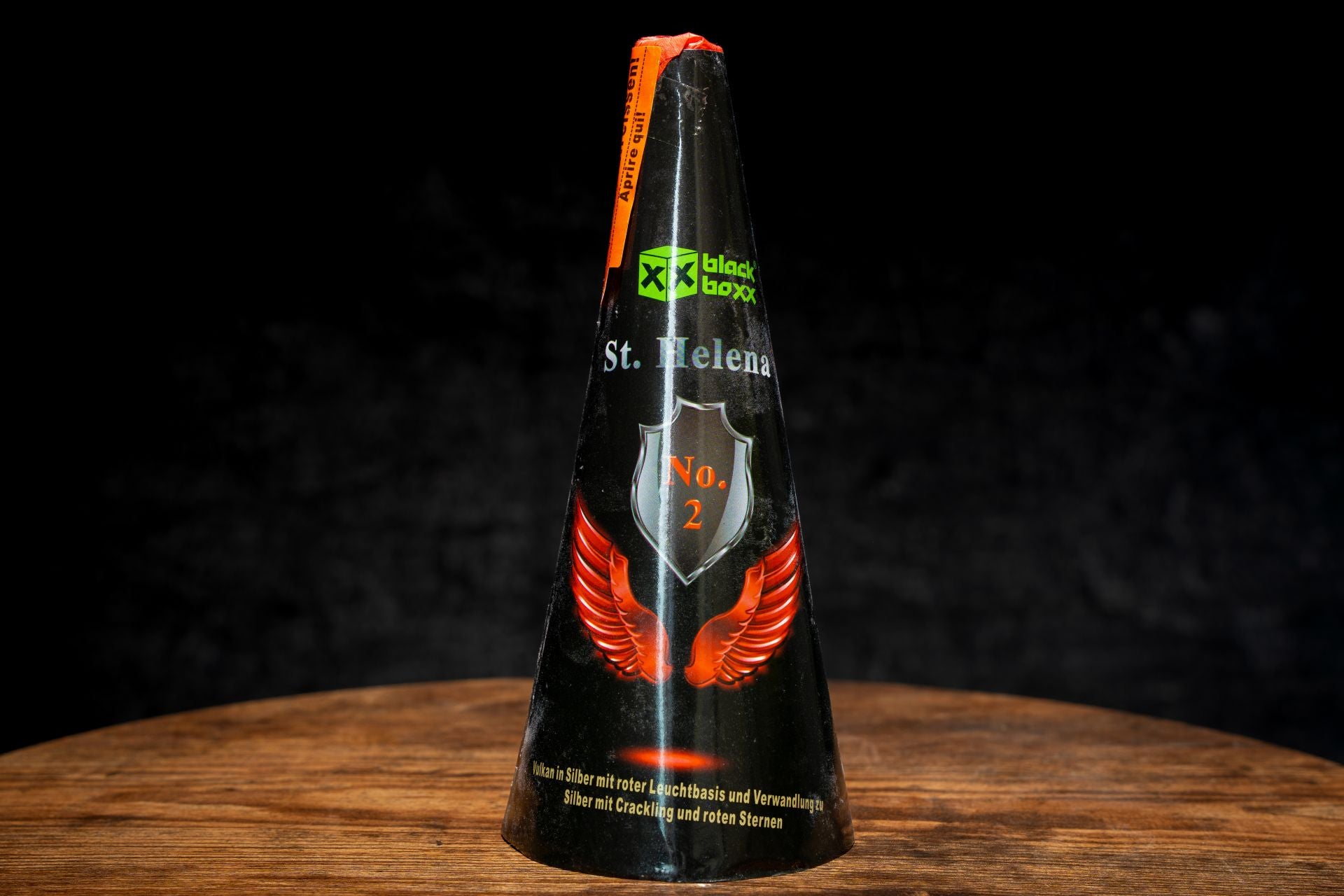 Großer 8" Vulkan in Silber mit roter Leuchtbasis und Verwandlung zu Silber mit Crackling und roten Sternen, raucharm und hoch steigend