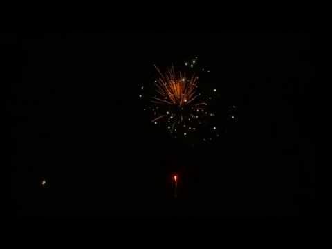 Aufstieg von blauen Kometen, die sich zu Buketts aus weißen Blink-Sternen zerlegen im Wechsel mit roten Kometen, die sich zu großen Gold-Palmen-Buketts (mit flimmernden Spitzen) zerlegen.